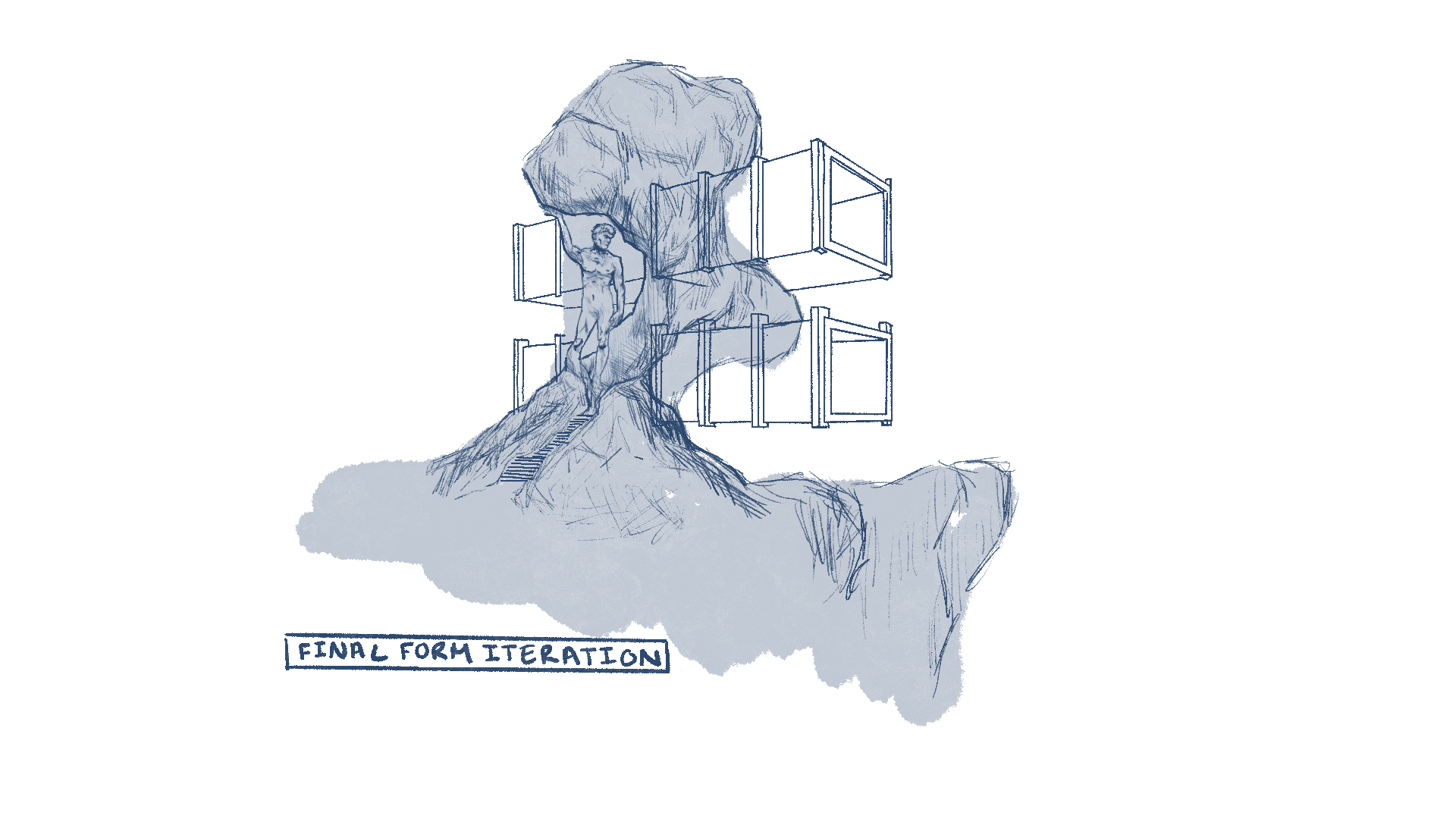 The central rock forms the core of the building. A massive, imposing anchor that defines the entire spatial experience Embedded within it is a sculpted figure of the Commendatore, the very force that both supports the structure and forewarns its eventual collapse.